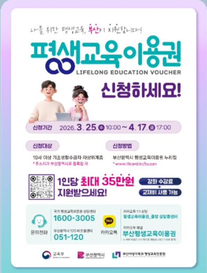 '경제적 여건에 따른 교육격차를 완화하고, 저소득층 성인의 자기계발 및 자아실현을 지원하기 위해' 2026년 부산광역시 '평생교육이용권’ 1차 신청접수공고