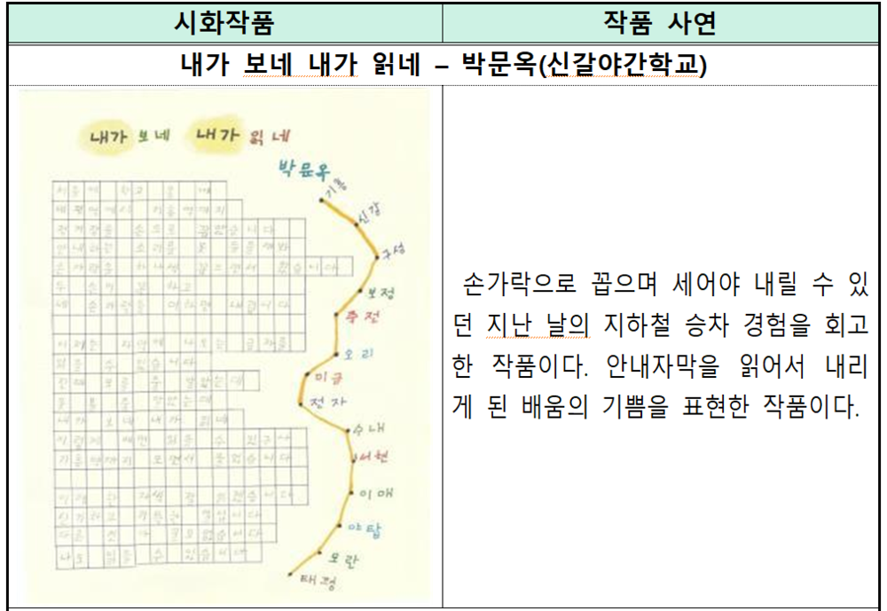 ㅇ 이번 시화전에서는 ‘손가락으로 꼽으며 세어야 내릴 수 있던 지난 날의 지하철 승차 경험을 회고하며, 안내자막을 읽어서 내리게 된 배움의 기쁨’을 표현한 “내가 보네 내가 읽네”를 쓴 박문옥(69세, 글꿈상)씨를 비롯하여 총 197명*이 수상의 영예를 안았다. * [시화] 글꿈상(최우수상) 10명, 글아름상(특별상) 60명, 글봄상(우수상) 80명 [엽서] 글꽃상 47명