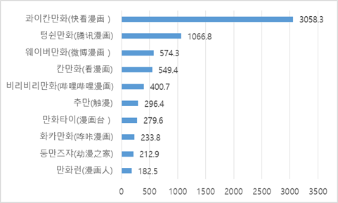 첸잔산업연구원(前瞻产业研究院)의 자료에 따르면 2021년 중국 애니메이션 모바일 앱 활성 이용자 수 상위 10위 앱에는 콰이칸(快看), 텅쉰(腾讯), 웨이보(微博), 칸만화(看漫画), 비리비리(哔哩哔哩) 등이 있다. 이 중 콰이칸(快看)의 앱의 사용자 수가 가장 많은 약 3058만 명으로 1위이며, 텅쉰(腾讯)앱 사용자 수가 약 1067만 명으로 2위를 기록했다. 콰이칸만화(快看)가 10대 앱 중 1위의 활성 사용자 수를 보유한 이유는 다음 세 가지가 있다. 첫 번째는 대중적인 애니메이션 작품 위주로 서비스하고 있어 신규 사용자 유입이 활발하다는 점이다. 두 번째는 원작을 짧게 요약한 소개 콘텐츠를 활용해 애니메이션을 홍보하는 것이다. 숏폼을 선호하는 사용자들에게 작품에 대한 흥미를 일으키고 이를 통해 유입을 확대한다. 마지막으로 앱 내 커뮤니티 서비스를 제공해 사용자 간 교류할 수 있도록 해 작품에 좀 더 몰입하도록 지원한다. 다른 앱과 차별화되는 서비스를 제공해 가장 많은 이용자를 확보할 수 있었다.