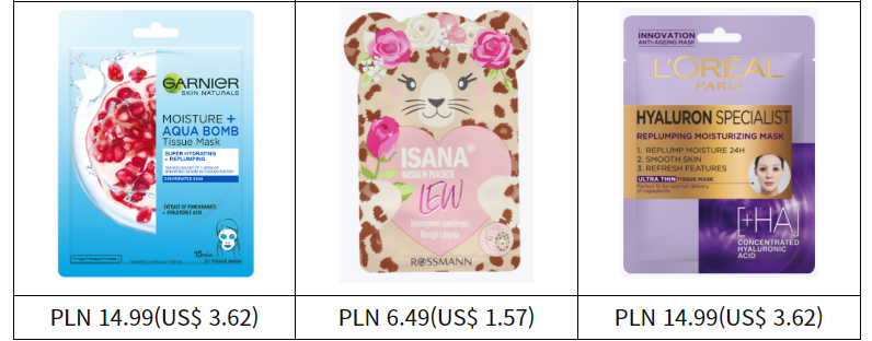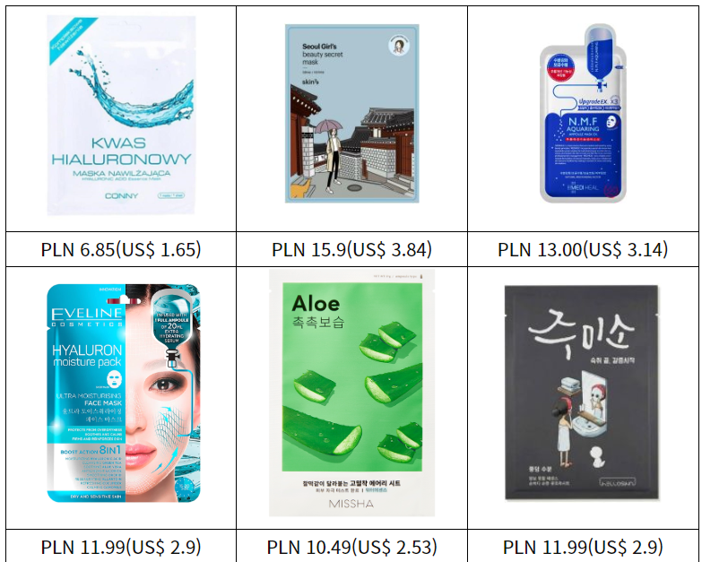 폴란드에서 인기를 끌고 있는 마스크팩의 가격대를 보면 10~15즈워티대(약 3200~4800원)가 가장 많은 것으로 나타났다.