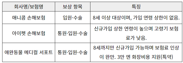 일본 내 반려동물 보험 가입률은 약 전체 개와 고양이 수의 15%로 추정된다. 17여 개의 손해보험사와 소액 단기보험회사가 반려동물 보험을 취급하고 있다. 애니콤사는 8세 이상 반려동물 전용 '동물건강보험'을 제공한다. 예를 들어, 70% 보장의 경우 인기 있는 토이 푸들은 월 3070엔, 고양이는 1390엔 정도의 보험료가 책정된다고 한다.