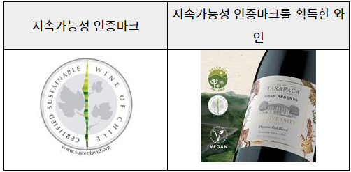 칠레 와인의 지속가능성 인증제도는 도입 10년 만에 주목할만한 성과를 거두었다. Investchile에 따르면 와인 수출의 80% 이상이 지속 가능 인증을 받았다. 지속가능성 인증에는 농업 관행부터 사회적 책임까지 다양한 표준에 대한 평가가 포함된다. 특히 지속 가능한 토양 관리, 질병 통제, 폐기물 감소, 에너지와 물의 효율적인 사용이 포함된다. 또한 칠레 와이너리는 LED 조명, 태양 에너지, 고효율 증기 발생 시스템과 같은 기술을 통합하여 에너지 효율성을 향상시키는 데 중점을 두고 있다.