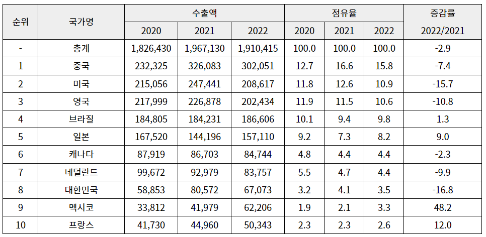 Global Trade Atlas에 따르면 칠레의 와인 시장 주요 교역 상대국은 중국, 미국, 영국 순이고, 한국은 교역 상대국 8위를 차지하고 있다.