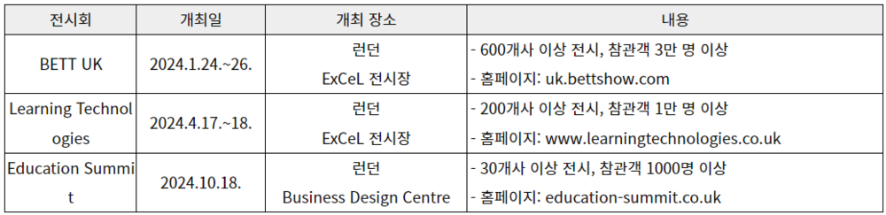 영국에서 개최되는 주요 에듀테크 관련 대형 전시회에 참석하는 것도 주요 방법이다. 전시회 참석을 통해 혁신기술을 선보이고 주요 글로벌 교육 이슈들을 파악할 수 있다. 영국에서 개최되는 에듀테크 관련 전시회는 아래와 같다.