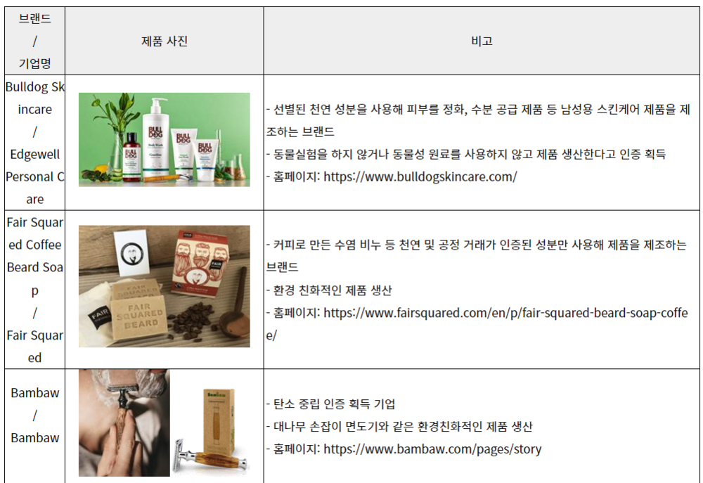 최근 뷰티 및 퍼스널 케어(Beauty and Personal Care, BPC) 시장은 친환경적이고 사회적 책임감 있는 접근 방식을 핵심 가치로 채택하고 있다. 이러한 추세에 남성용 그루밍 제품 시장도 적극적으로 편승하고 있다. 제품의 성분뿐만 아니라 생산 과정에서 ‘기업이 환경과 사회에 대한 책임 있는 태도를 어떻게 반영하느냐’가 점점 더 중요해지고 있다.