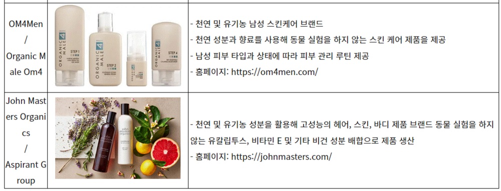 * 자료: Grand View Research, Mintel, Bulldog Skincare, Fair Squared, Bambaw, OM4Men, John Masters, CNBC, Statista, Research and Markets, Cosmetic Business, Global Trade Atlas, KOTRA 디트로이트 무역관 자료 종합