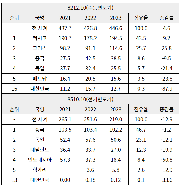 주: HS코드 8212.10와 8510.10 기준, 각 년도 1월부터 11월까지의 수입액 비교