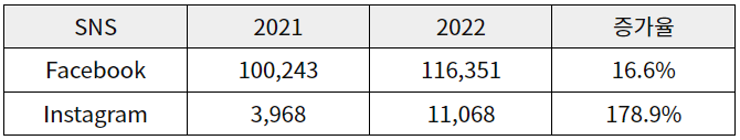 데이터 분석 기업 Qsearch 조사에 따르면 2022년 SNS상의 캠핑 주제 포스팅이 모두 전년 대비 증가했다. 특히 Instagram 포스팅 수는 전년 대비 178.9%로 높은 증가율을 보였다. 시기별로 분석해 보면, 2021년 5월 대만 내 코로나 방역경보가 3단계로 상향됐던 시기에 캠핑 포스팅 수가 한 달 만에 30% 하락했다. 같은 해 7월 방역경보가 하향 조치 되면서 포스팅이 점차 늘어났으며, 2022년 3월에는 2021년 7월 대비 68% 회복한 모습을 보였다.