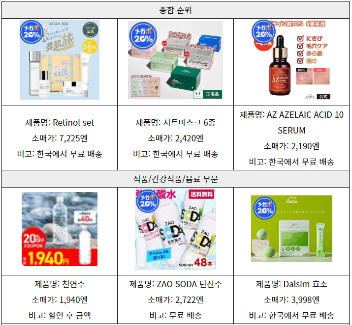 종합 랭킹을 보면 한국 화장품이 TOP3에 올라와 있고 1위부터 3위까지 모두 스킨케어 제품이 차지했다. 이베이재팬에 의하면 메가와리 인기 키워드는 '데이지크(Dasique)', '토리덴(Torriden)', '브이티(VT)', '퓌(fwee)', '티르티르(TIRTIR)' 등 현재 화제인 한국 화장품 브랜드로, 한국 화장품에 대한 주목도가 높은 것을 알 수 있다. 패션·잡화 부문에서는 한국에서도 인기가 있는 VARZAR의 모자나 SNS에서 화제가 된 ETERNAL YOU 브랜드의 에코백이 많이 판매되었고, 신학기(4월)를 앞두고 가격 경쟁력과 디자인이 뛰어난 백팩의 인기도 높았다고 분석한다.
