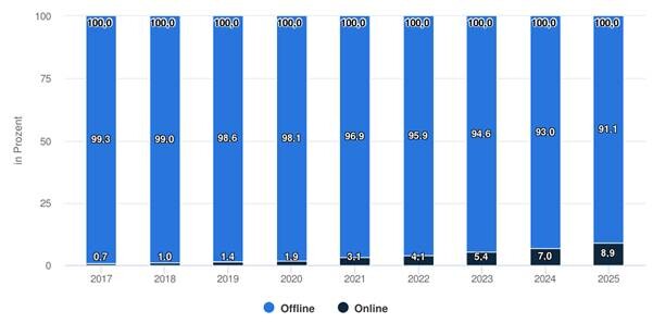 <독일 소비자들의 온·오프라인 구매 비율(2017~2025년)>