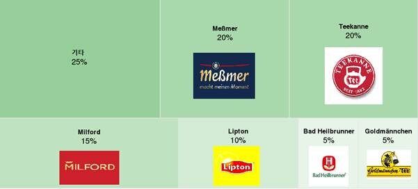 다음으로 수요가 높은 독일의 차 브랜드를 알아보자. 독일에서 가장 시장 점유율이 높은 차 브랜드는 Meßmer와 Teekanne였다. 2020년 기준 두 브랜드의 시장 점유율은 각 20%였고, 그 뒤로 Milford(15%), Lipton(10%), Bad Heilbrunner(5%), Goldmännchen(5%), 그 외 기타 브랜드들이 25%의 점유율을 보였다.