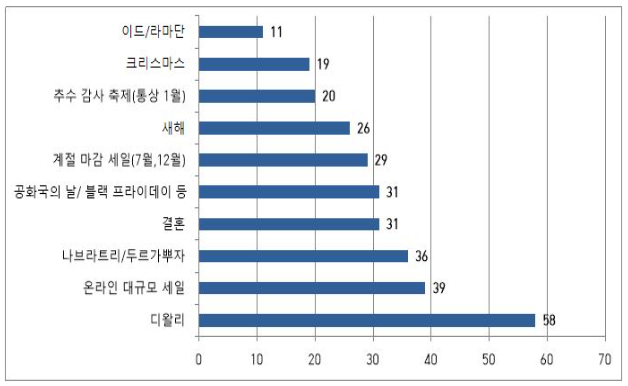 축제 시즌은 다양한 브랜드들의 판매 대목이다. 이에 업체들은 축제 기간에 맞추어 할인 행사를 진행한다. 가격 할인으로 소비자들의 이목을 끌고, 축제 기간에 상품 수요량이 증가한다는 점을 이용해 업체들은 각종 마케팅 전략을 수립하여 매출을 증가시킨다.