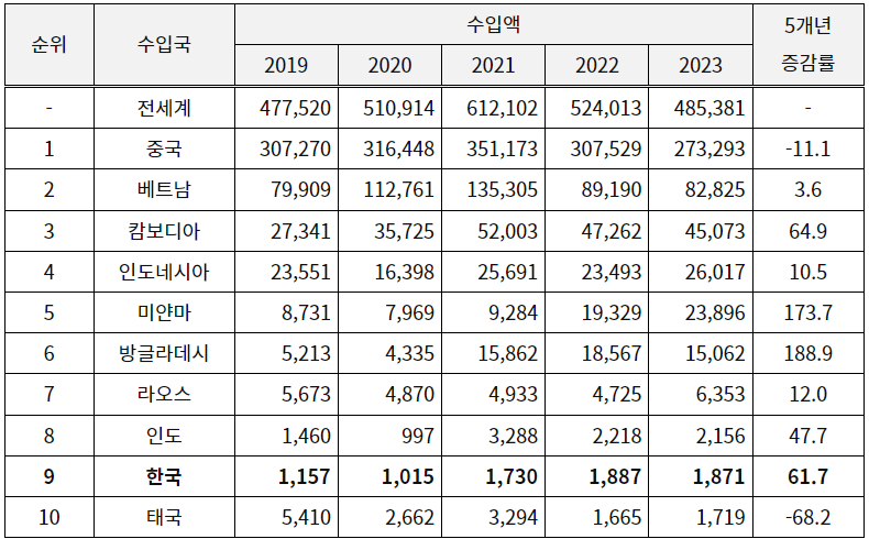 레깅스의 HS코드 품목분류는 현재 해설서상 기준이 명확하지 않으나, 보편적인 바지류 기준으로 일본 시장 수입 동향을 살펴보면 2023년 한국으로부터의 수입액은 187만 달러로 9위를 차지했으며 5개년 증감률은 61.7%이다. 유명 해외 브랜드의 생산 공장이 미얀마, 방글라데시 등 동남아시아에 다수 소재한 점을 고려한다면 한국 수출이 높은 성장률을 보인다고 해석할 수 있다.