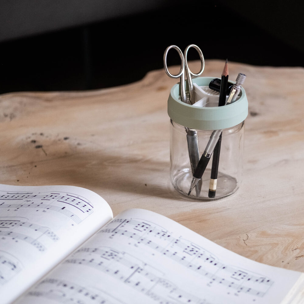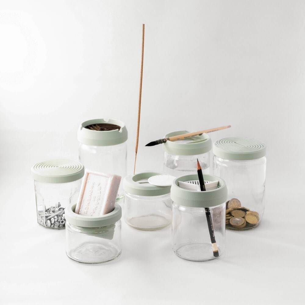 이들의 ‘업사이클 유리병(Upcycled Jars)’ 컬렉션은 익스트루드.스튜디오의 지향점이 무엇인지를 잘 보여주는 작업이다. 유리병 자체는 어느 가정에나 있을 법한 보통의 것으로, 지름 78mm의 기성 표준 유리병이다. 익스트루드.스튜디오는 여기에 꼭 맞는 여러 가지 ‘뚜껑’을 제작했다. 그리고 그 뚜껑의 종류에 따라 유리병의 용도가 달라진다.