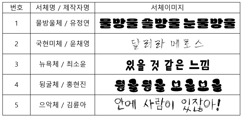 이번 전시에서는 서체 개발 과정이 담긴 자료와 서체를 활용한 영상물, 포스터, 엽서, 키링 등을 선보인다. 서체는 △둥근 물방울에서 아이디어를 얻은 ‘물방울체’(유정연) △세련된 디자인의 ‘국현미체’(윤채영) △공포 장르의 디자인과 어울리는 ‘으악체’(김륜아) △간결하고 깔끔한 느낌의 ‘뉴욕체’(최소윤) △포인트를 주기 좋은 ‘뒹굴체’(홍현진) 총 5종이다.