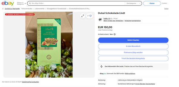 또한, 스위스 초콜릿 브랜드 린트(Lindt)는 2024년 두바이 초콜릿을 한정판으로 출시했다. 린트의 두바이 초코릿은 틱톡과 인스타그램 등 소셜미디어 바이럴 효과로 대중의 관심을 받았다. 베를린, 프랑크푸르트, 함부르크 등 주요 도시에서 단 1000개만 판매됐으며, 높은 희소성과 제한된 공급량으로 인해 매장 앞 긴 줄과 중고 거래 사이트에서는 150유로의 높은 가격의 재판매를 유발했다.