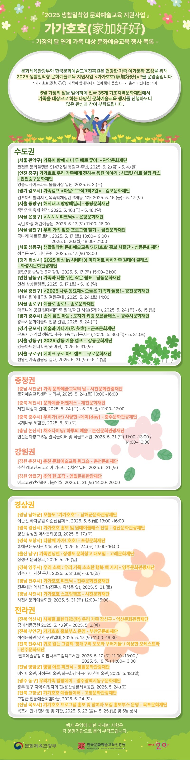 ◆ 가정의 달 연계...전국 35개 기초지역문화재단 생활권 문화예술교육 운영 가가호호 사업의 일환으로 전국 35개 기초지역문화재단(관악문화재단, 화성시문화관광재단, 춘천문화재단, 제천문화재단 등)은 가정의 달과 연계해 가족 단위 참여가 가능한 문화예술교육 행사를 생활권 가까운 곳에서 운영한다.
